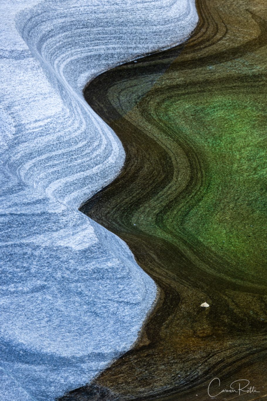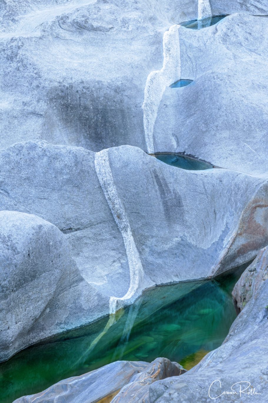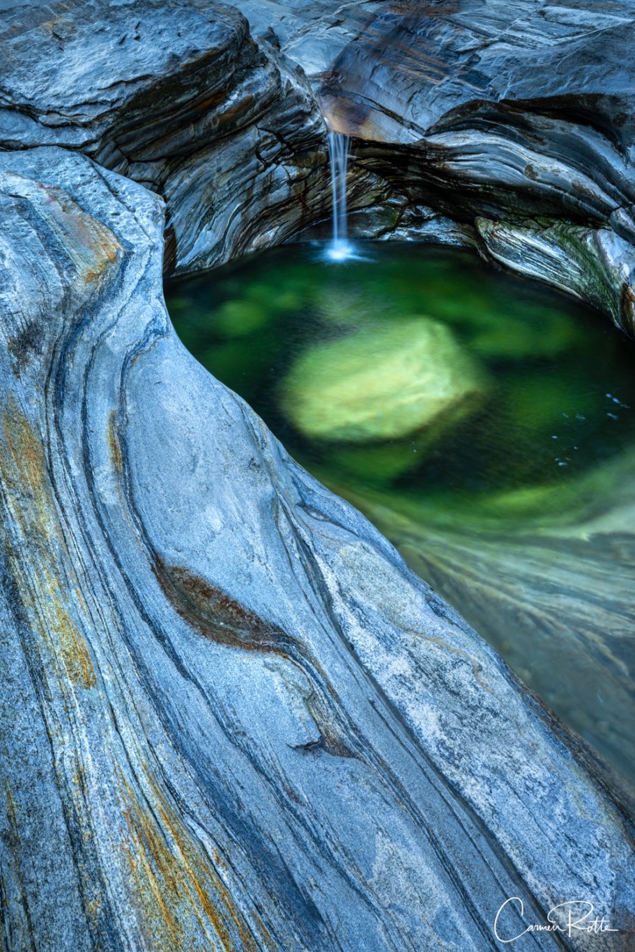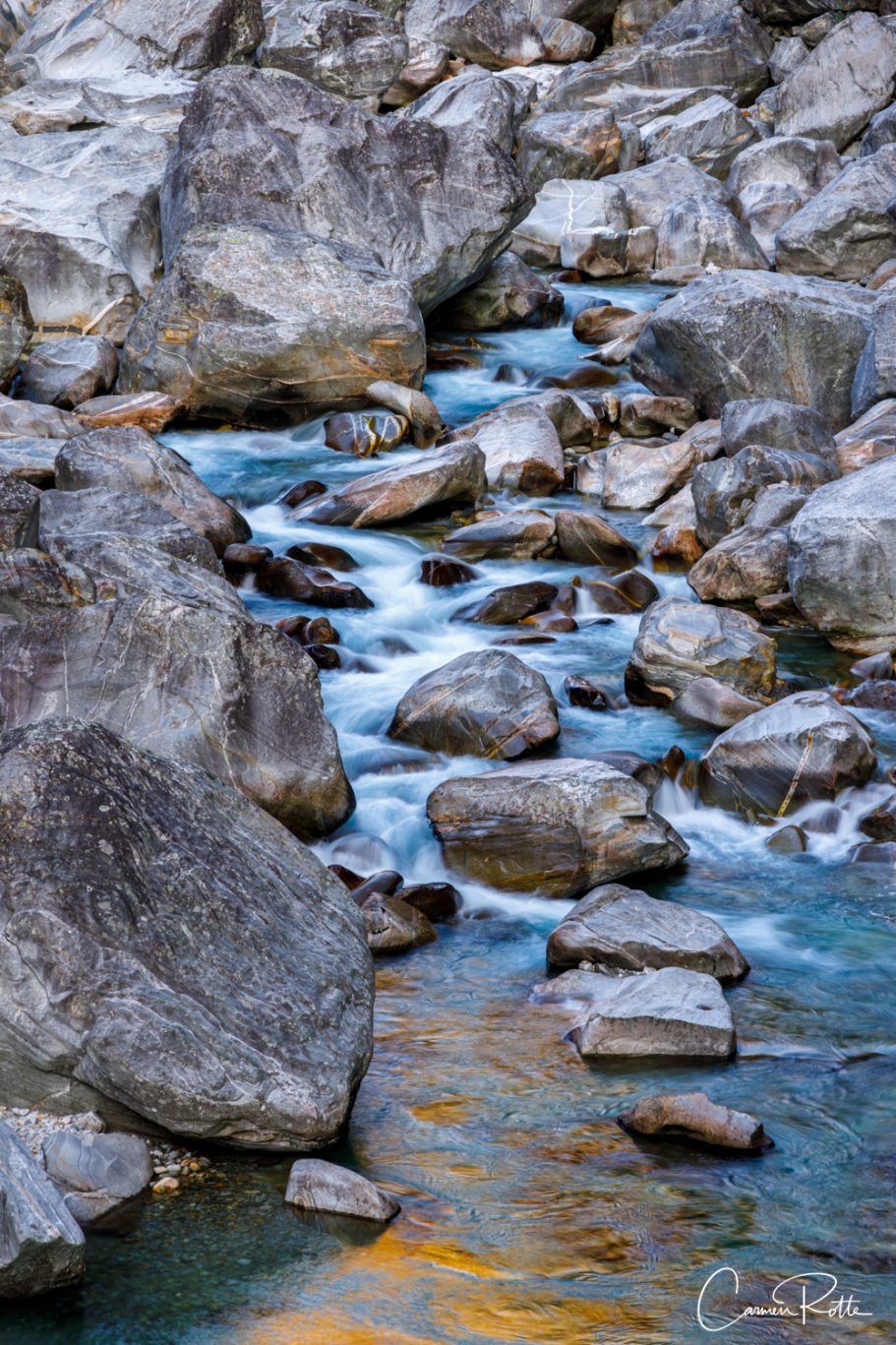 At a workshop with Radomier Jakubowski, we are standing at what I consider to be the most beautiful spot in the Valle Versasca. There are so many different structures, shapes and colors right next to and in the river that I find it really hard to focus on one subject. What I like to do in such moments is to pack up the camera again and walk back and forth until the impressions sort themselves out.